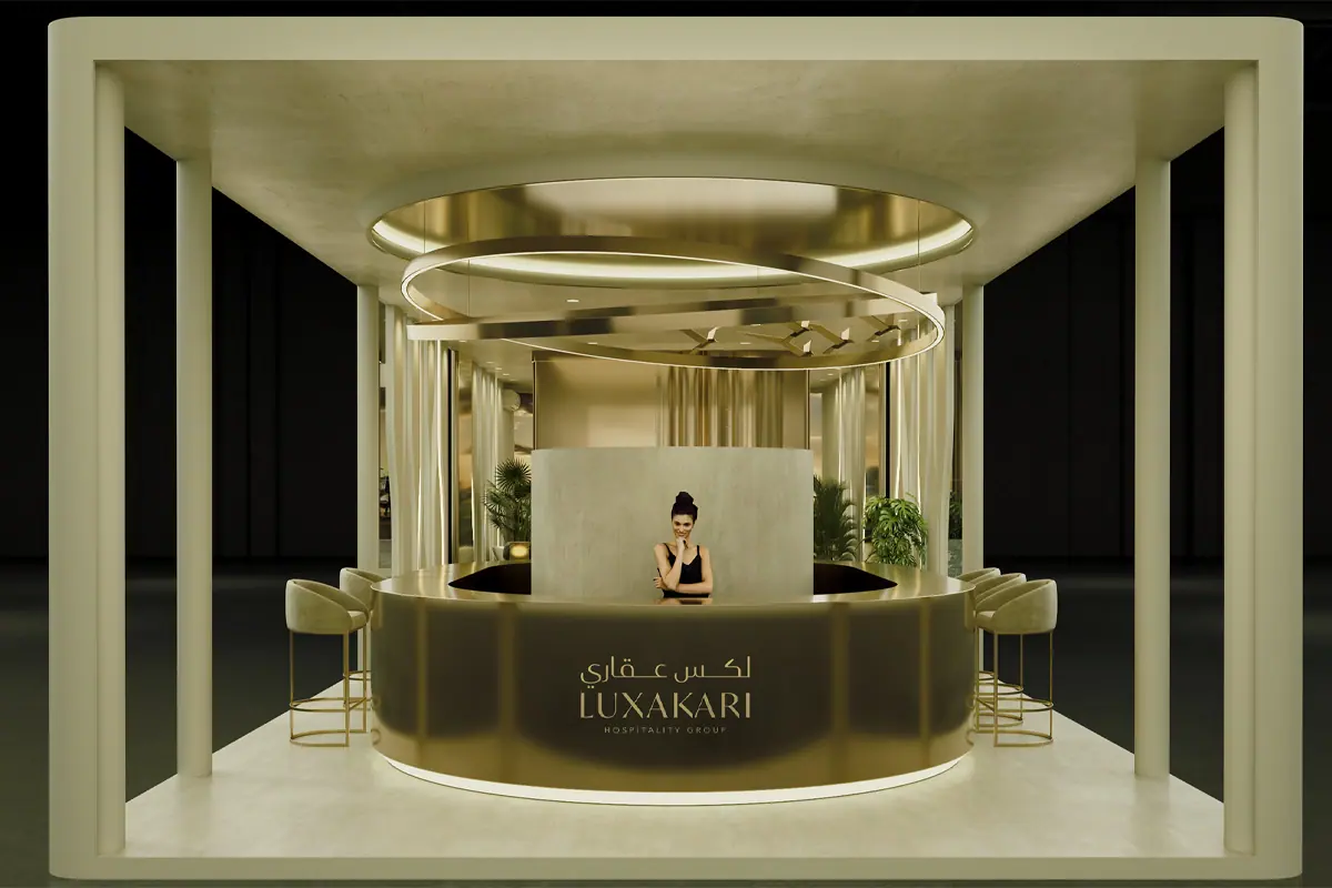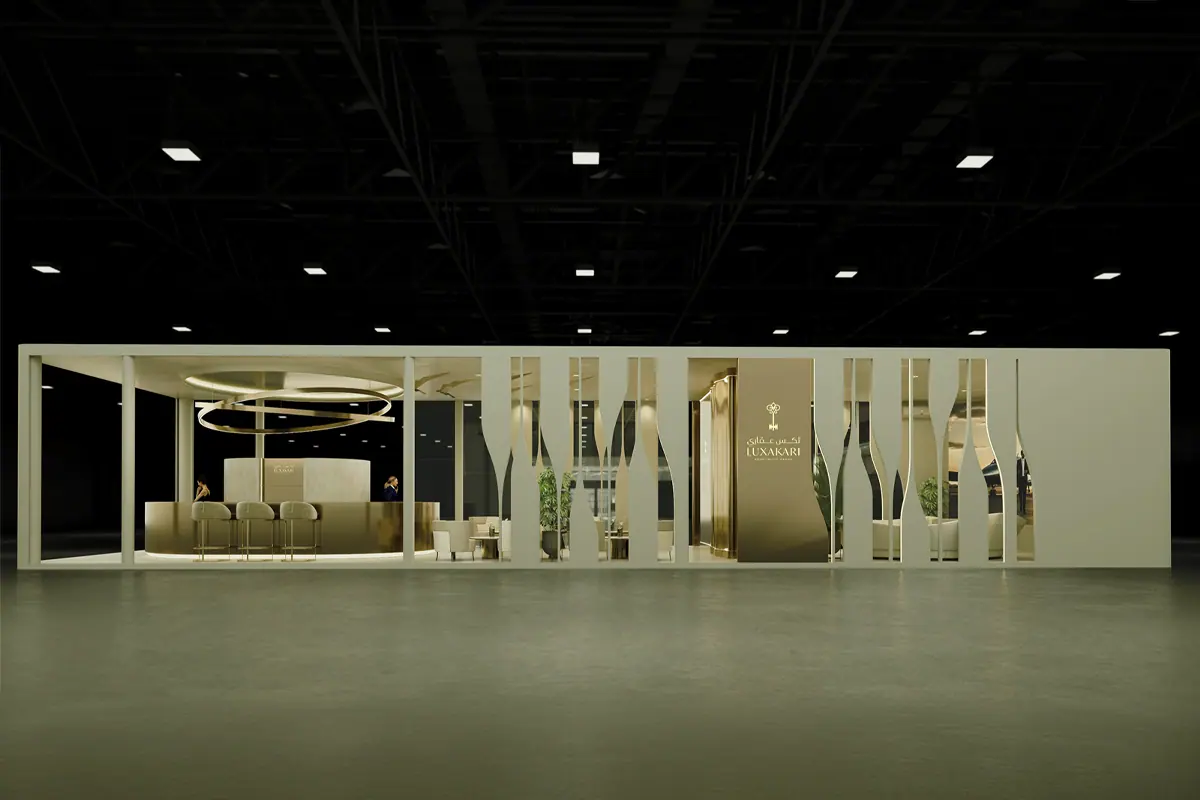 A bespoke urban exhibition stand design proposal developed for Luxakari in Saudi Arabia. AURA 919 delivered architectural concept development, 3D visualisation and spatial planning — showcasing how premium brand environments translate across the KSA market.