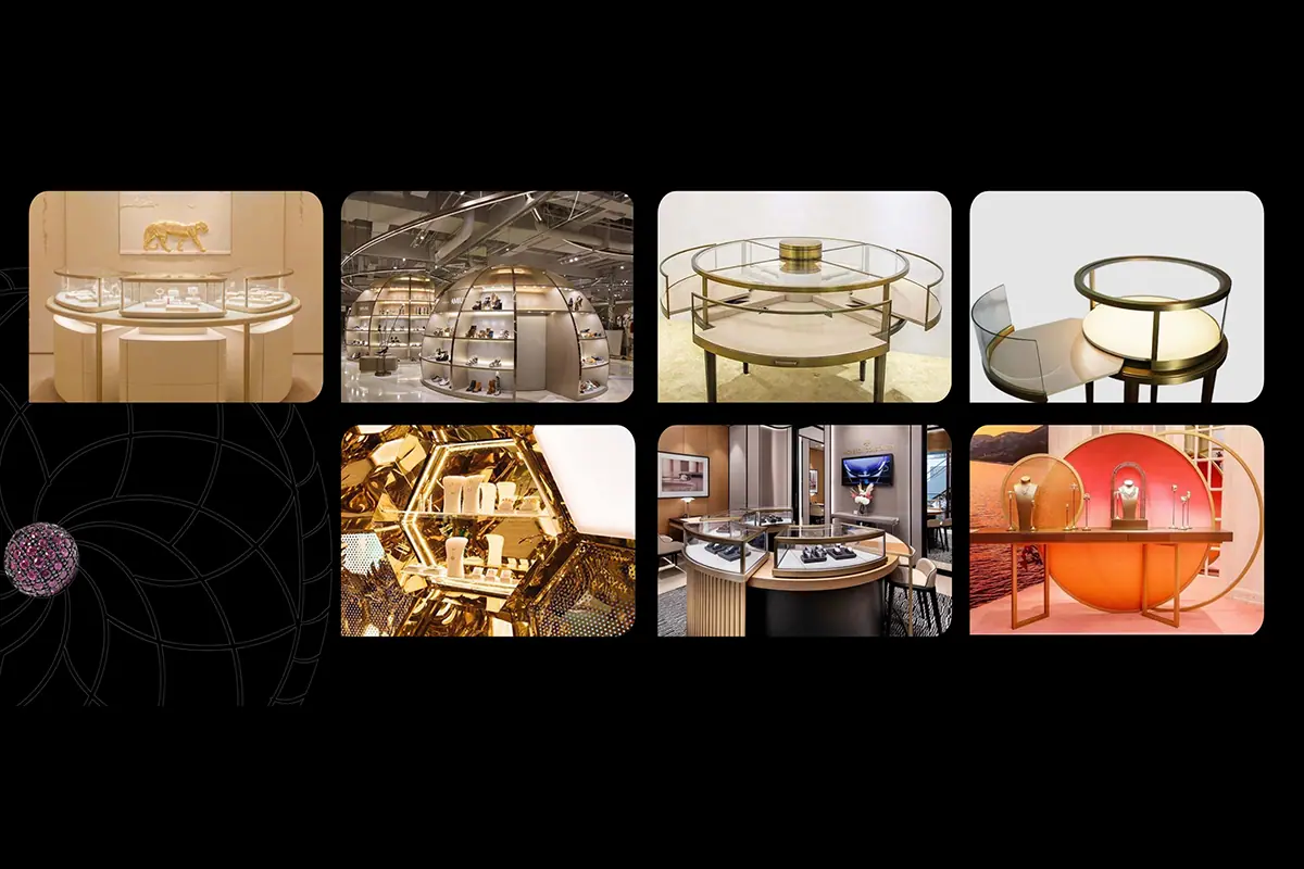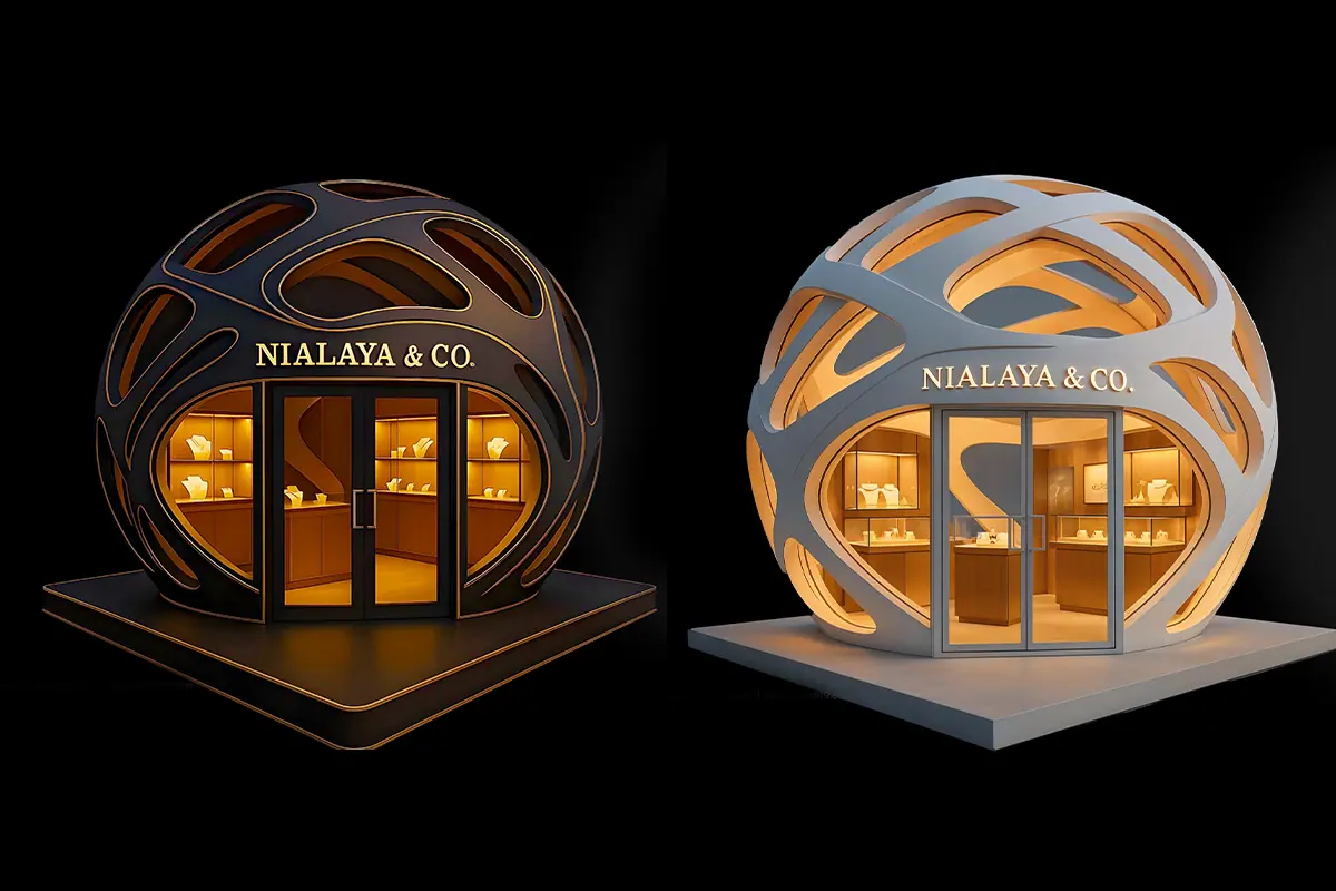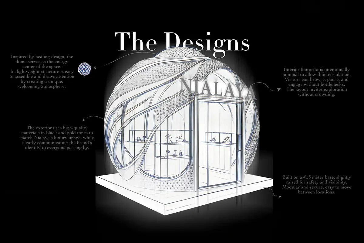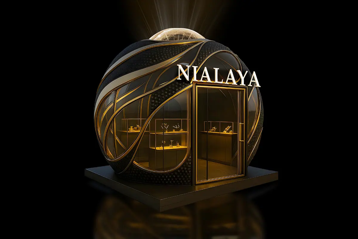 AURA 919 designed a bead-inspired luxury pop-up stand for Nialaya Jewelry at Cove Beach Dubai. The 4×3m spherical dome structure — rendered in black, gold and glass — translated Nialaya's signature bead into a physical retail environment combining premium jewelry display, digital light technology and an immersive brand experience designed for high-traffic outdoor locations.