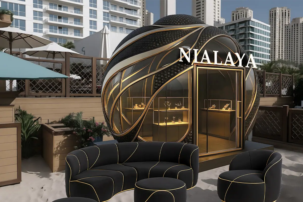 Nialaya Jewelry — Handmade in Hollywood — needed a pop-up retail experience at Cove Beach Dubai that could operate as both a luxury boutique and a brand statement. The structure had to be visually arresting in a high-footfall beach environment, modular enough to move between locations, and capable of housing premium jewelry display cases with a secure, safe interior for high-value stock.